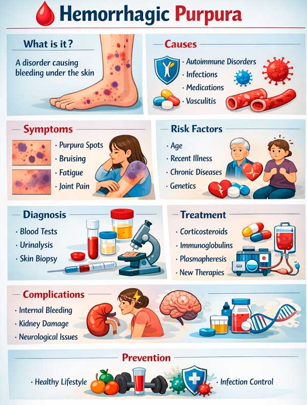 Hemoragisk purpura er ikke en egen sykdom, men et klinisk syndrom karakterisert ved forekomsten av flate, hemoragiske lesjoner på huden og noen ganger på slimhinnene som ikke forsvinner med trykk. Enkelt sagt er dette synlige blødninger i huden som oppstår på grunn av nedsatt hemostase, økt vaskulær skjørhet, betennelse i karveggen eller en kombinasjon av disse mekanismene. Den nåværende internasjonale klassifiseringen av sykdommer, 11. revisjon, beskriver eksplisitt purpura som en purpuraktig, ikke-bleknende hudforandring på grunn av blødning, som kan manifestere seg som petekkier og ekkymoser og være det første tegnet på en rekke sykdommer. [1]