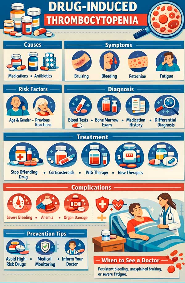 En av de viktigste risikofaktorene er polyfarmasi. Jo flere medisiner en pasient tar samtidig, desto vanskeligere er det å oppdage årsaken i tide, og desto større er sjansen for at trombocytopeni virkelig er medikamentindusert. Dette er grunnen til at problemet er spesielt akutt på sykehus, intensivavdelinger, onkologiske avdelinger og hos eldre pasienter med flere kroniske sykdommer. [24]